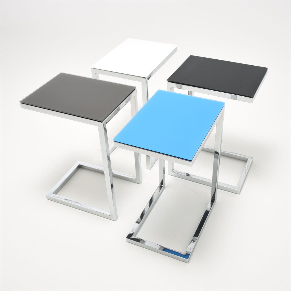 We stock the Piccolo table with a Matte-painted White tempered glass top on chrome frame. Also available in stock in Turquoise on chrome frame, and in Grey glass on chrome frame and on satin nickel frame.
