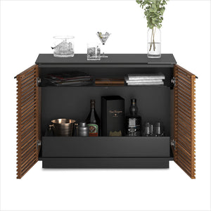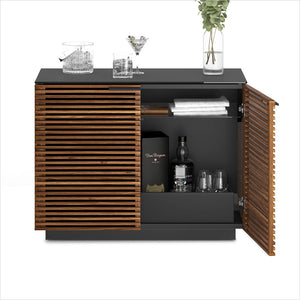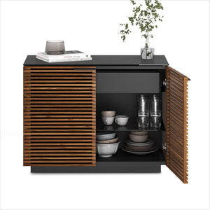 The Corridor 8108 has an adjustable glass shelf that provides ideal two-compartment storage for a variety of items. A lined drawer can be positioned at the top or bottom of the cabinet, allowing for further customization, from extra storage to a convenient serving tray.