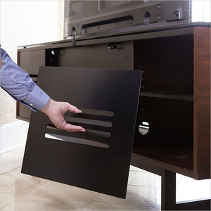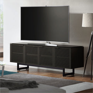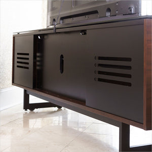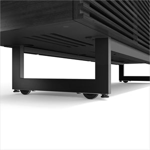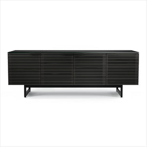The striking Corridor cabinet in Charcoal Stained Ash features louvered doors of solid ash that allow a speaker’s sound or a remote control’s signal to pass through unobstructed. The two center doors open to reveal a large compartment with an adjustable shelf, allowing Corridor to accommodate a wide range of speakers or components. The cabinet features a black, micro-etched glass top and black steel legs. Optional concealed wheels are included.