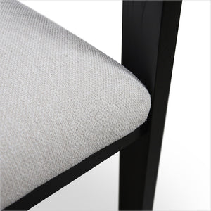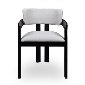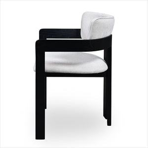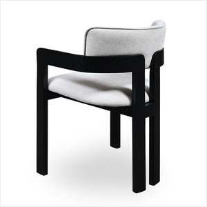 • Introducing the Marco dining armchair, a sleek and modern addition to your kitchen or dining room. Crafted with a matte black oak frame and soft fabric, this chair is a perfect blend of style and comfort. Elevate your dining room with this statement piece.