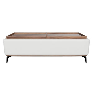 • The Oslo ottoman features ALL top grain leather as well as beautiful wood detailing in Dark Walnut finish - matched with Black stiletto legs. The Oslo ottoman has ample storage underneath its flip-top - which also allows the ottoman to serve as a coffee table/tray when reversing the top.