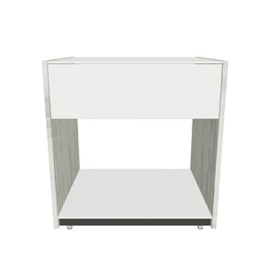 The 1-drawer Vision nightstand is stocked in Meteor powder-coated metal with Fog Oak wood with an anti-glare and anti-fingerprint, etched, tempered glass top in Neige finish. This combination features Quinn 614 fabric lining of the drawer.