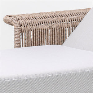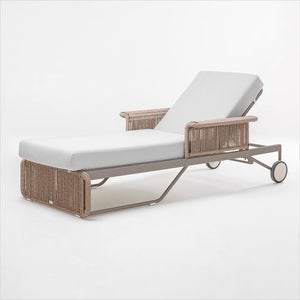 • The Lotus is a contemporary chaise lounge for outdoor use. We stock the Lotus with a soft cushion in Coconut fabric combined with Natural twist wicker in a Vertical Weave on a Champagne powder-coated metal frame.