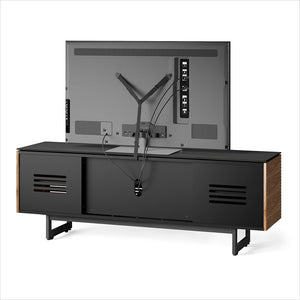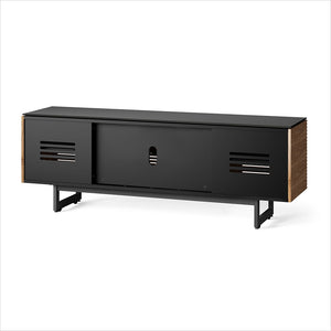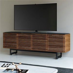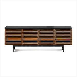 • The striking Corridor cabinet in Natural Walnut features louvered doors of solid wood that allow a speaker’s sound or a remote control’s signal to pass through unobstructed. The two center doors open to reveal a large compartment with an adjustable shelf, allowing Corridor to accommodate a wide range of speakers or components. The cabinet features a black, micro-etched glass top and black steel legs. Optional concealed wheels are included.