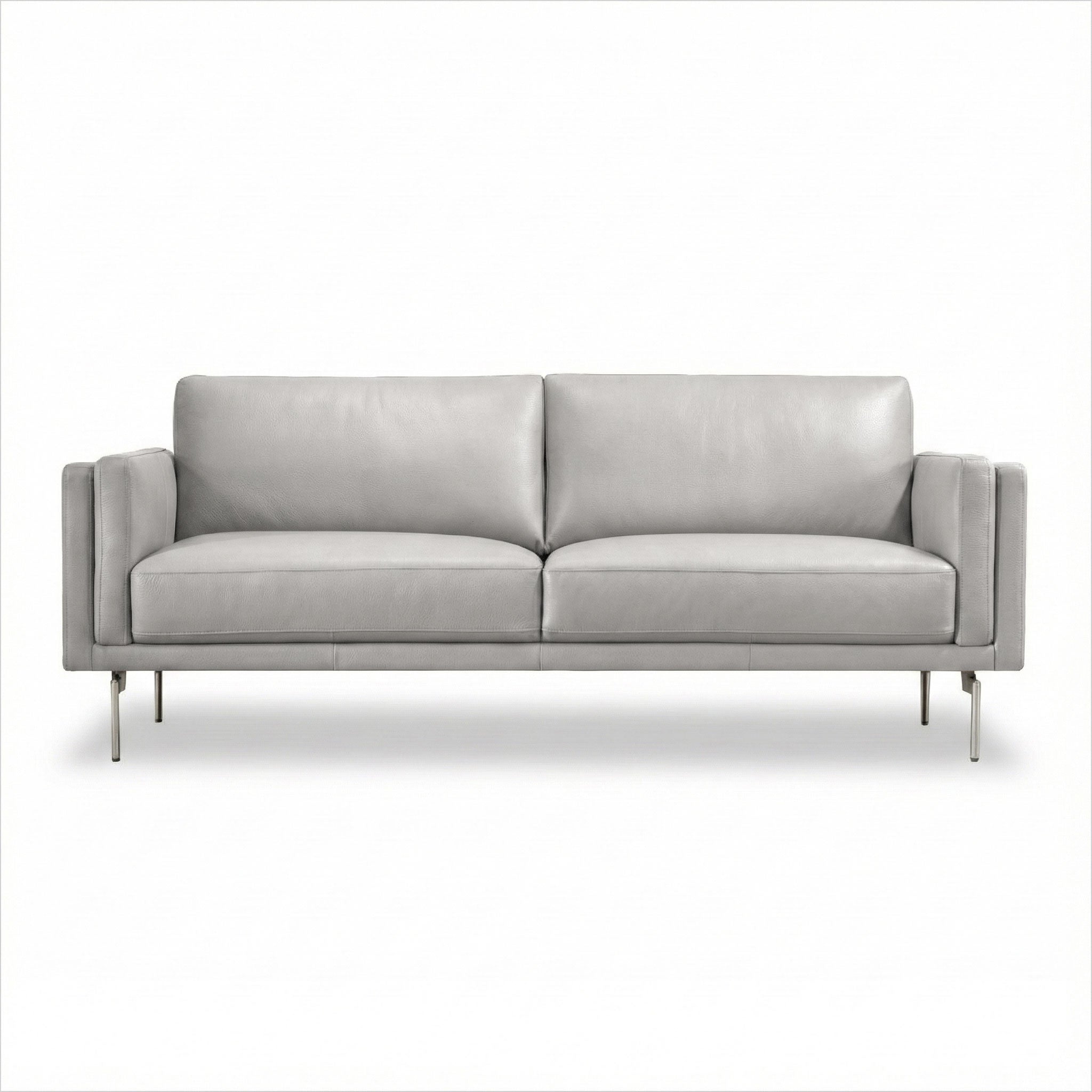 The Draper sofa is stocked in Light Grey leather with Stainless Steel legs. Also available in stock in Saddle leather and in Black leather.
