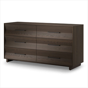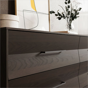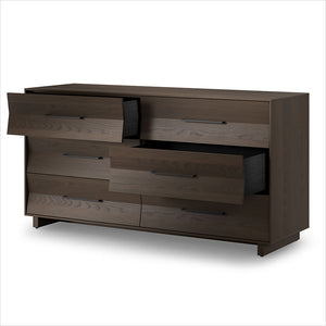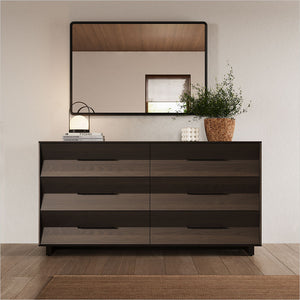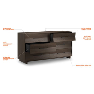Designed for spacious storage with a refined touch, the Kava 6-Drawer dresser offers generous soft-close drawers with textured black interiors and a removable velvet-lined accessory tray for smaller essentials. Engineered for function and safety, it features a sturdy-compliant interlock system that prevents multiple drawers from opening at once. Crafted with a durable hardwood veneer, its clean lines and modern silhouette make it the perfect anchor for a contemporary bedroom.
