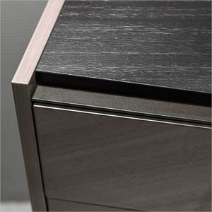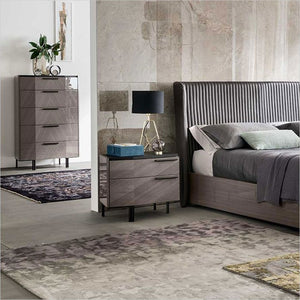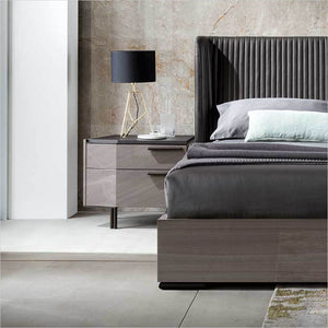The luxurious Leones nightstand is part of an Italian-made bedroom series in beautiful Eucalyptus Velvet High Gloss paired with Dark Mahogany Matte finish.