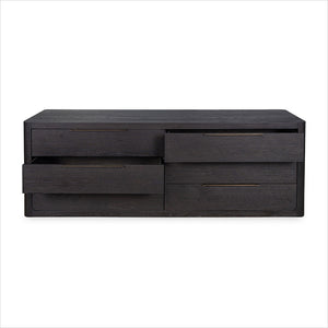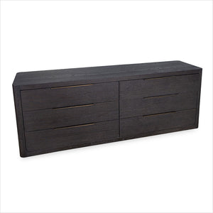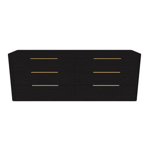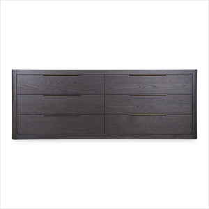 This Luna dresser is perfect for organizing your bedroom. Featuring 6 drawers, it's perfect for storing your clothes, blankets, and other items. It features round edges in charcoal stained White Oak to add a beautiful contemporary softness to your space, and the sleek Bronzed finished handles add the perfect finishing touch.
