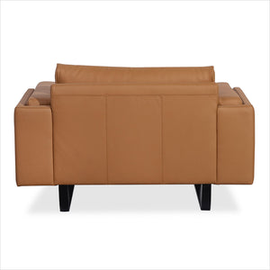 The Mason chair is stocked in Whiskey or light Tan leather and in a light Tan fabric.