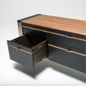 The Monarch is an impressive credenza with 6 drawers (3 storage / 3 filing drawers) made in walnut with black leather with white stitching. A large executive desk is available in the Monarch series.