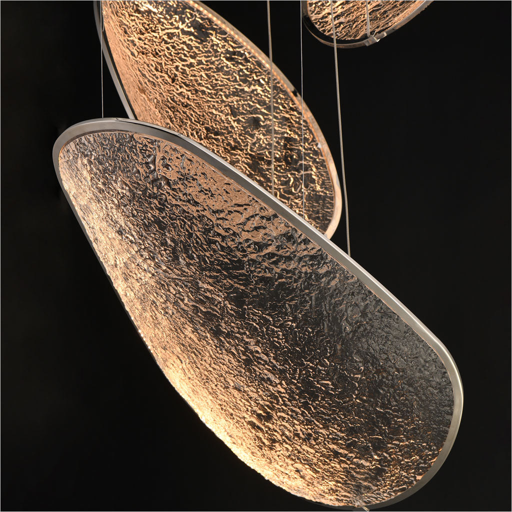 • Moonscapes is a dramatic, cratered LED installation that floats midair, casting soft, diffused light. Monumental yet ethereal, it creates a bold focal point for large, architecturally ambitious spaces.