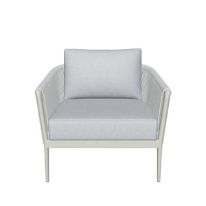 The Muse is a contemporary occasional chair for outdoor use. We stock the Muse with a soft cushion in Silver Grey fabric combined with a Silver round rope (15mm) in Vertical Weave on a Charcoal/Champagne powder-coated metal frame. The Muse occasional chair is built to ensure a long-lasting resistance to UV, chlorine and salt water. It is woven by weaving experts who take great pride in their unique craftsmanship.