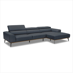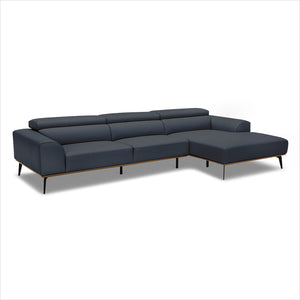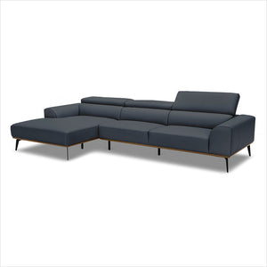 The clean, modern style of the Oslo sectional sofa features ALL top grain leather with decorative, contrast stitching on arms as well as beautiful wood detailing in Dark Walnut finish - matched with Black stiletto legs.
