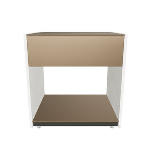 The 1-drawer Vision nightstand is stocked in Champagne powder-coated metal with Ivory Birch wood with an anti-glare and anti-fingerprint, etched, tempered glass top in Bronze Mirror finish. This combination features Shimmer Magnetite fabric lining of the drawer.